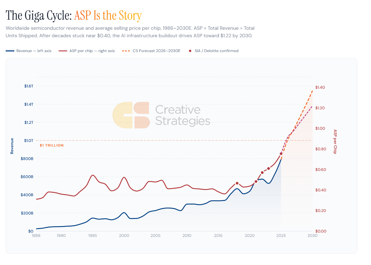 Memory is the primary driving force pushing the semiconductor industry past the long-awaited trillion-dollar revenue mark years in advance of the 2030 target. The industry will add roughly $208 billion in a single year from 2025 to 2026, more than the entire global semiconductor market generated annually as recently as 2003. What makes this cycle structurally different from every prior expansion is the source of that growth. From 1986 to 2020, the average selling price of a semiconductor oscillated in a $0.31–$0.44 band for 34 consecutive years. It has since doubled in just five years, reaching an estimated $0.91 in 2026 and tracking toward $1.22 by 2030. Unit volumes are projected to grow at roughly 4% annually through the end of the decade, yet revenue is compounding at 14%. The gap is entirely ASP. This is the first sustained period in industry history where pricing power, not volume, is the primary engine of value creation, and memory, particularly HBM and advanced DRAM, sits at the center of that shift.