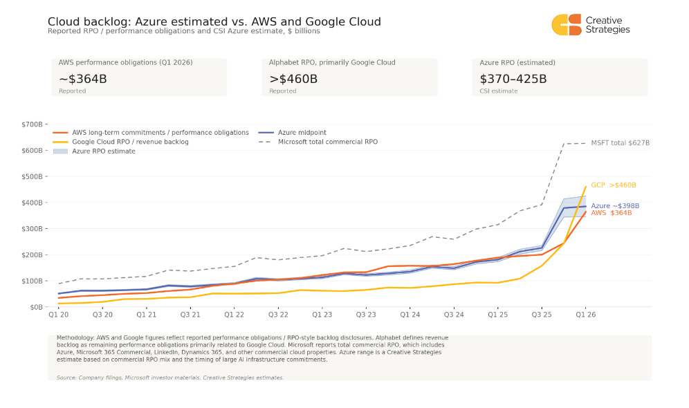 The broader cloud RPO and backlog data help explain why the debate over whether the AI infrastructure cycle is durable remains flawed. Across AWS, Google Cloud, and Microsoft, the forward revenue base tied to cloud and AI infrastructure has moved from steady compounding into a steeper AI-era slope. The numbers are not perfectly comparable: AWS discloses long-term performance obligations primarily related to AWS, Alphabet reports remaining performance obligations, or “revenue backlog,” primarily related to Google Cloud, and Microsoft reports total commercial RPO rather than Azure-specific backlog. Even with those caveats, the direction is useful. AI demand is now showing up in contracted revenue visibility across the major cloud platforms, adding another layer of evidence beyond management commentary, quarterly growth rates, and capacity announcements.
