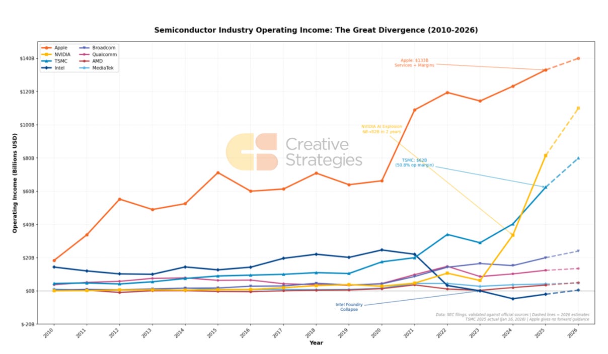 Set aside the cyclicality concern for a moment. TSMC’s execution is exceptional. Gross margins above 62% from a foundry remain remarkable. These are numbers we associate with Nvidia and Apple, not capital-intensive manufacturing businesses. Operating margins are tracking Nvidia’s trajectory. Revenue exceeded $100B for the first time in 2025 and now guides to nearly $160B in 2026. The value capture here is unlike anything the foundry business has seen.
